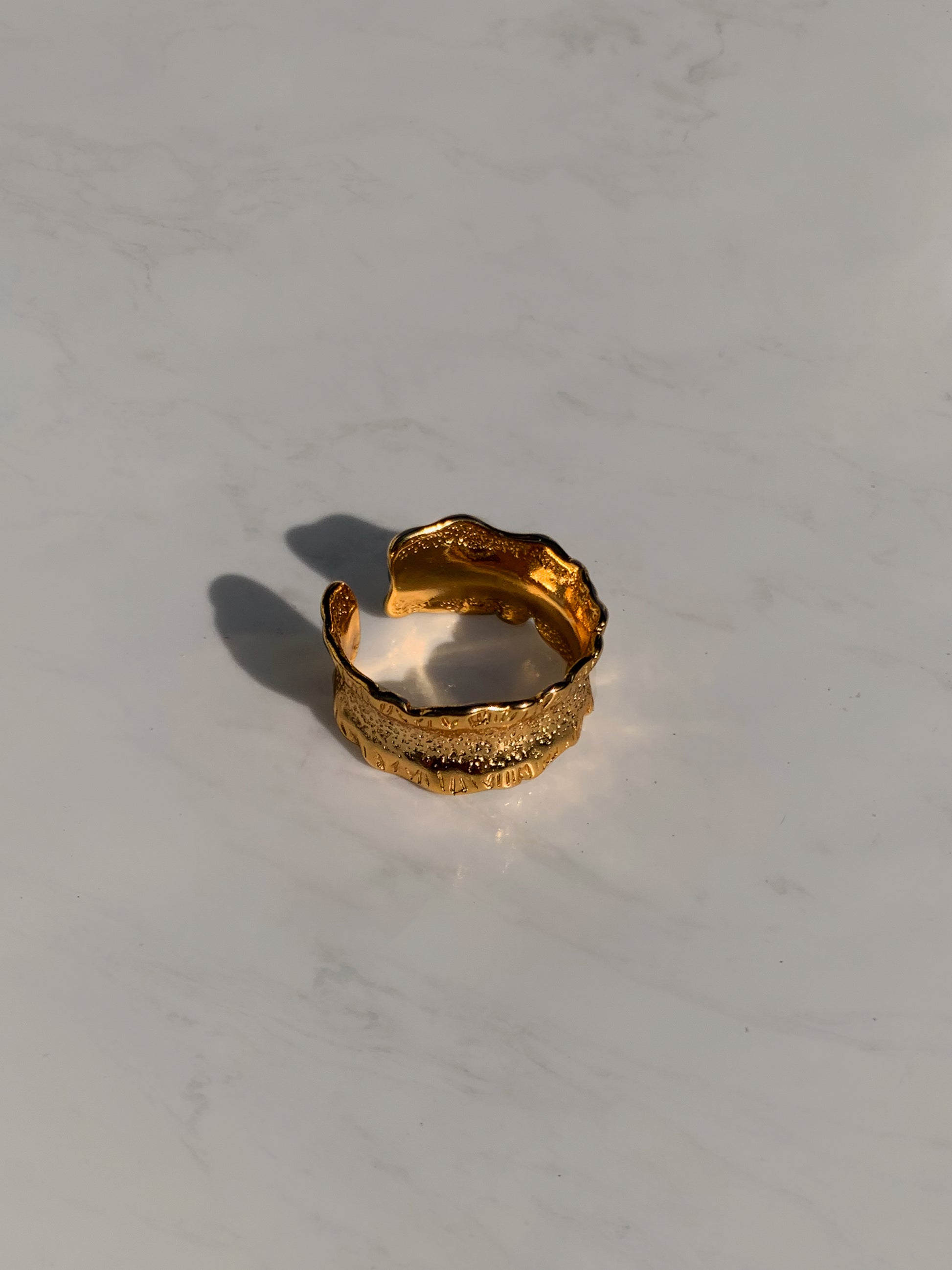 The ring is 18K Gold plated. The brass base has first been beautifully crafted into a marvelous shape that has later been carefully coated in a thick layer of 18K Gold.