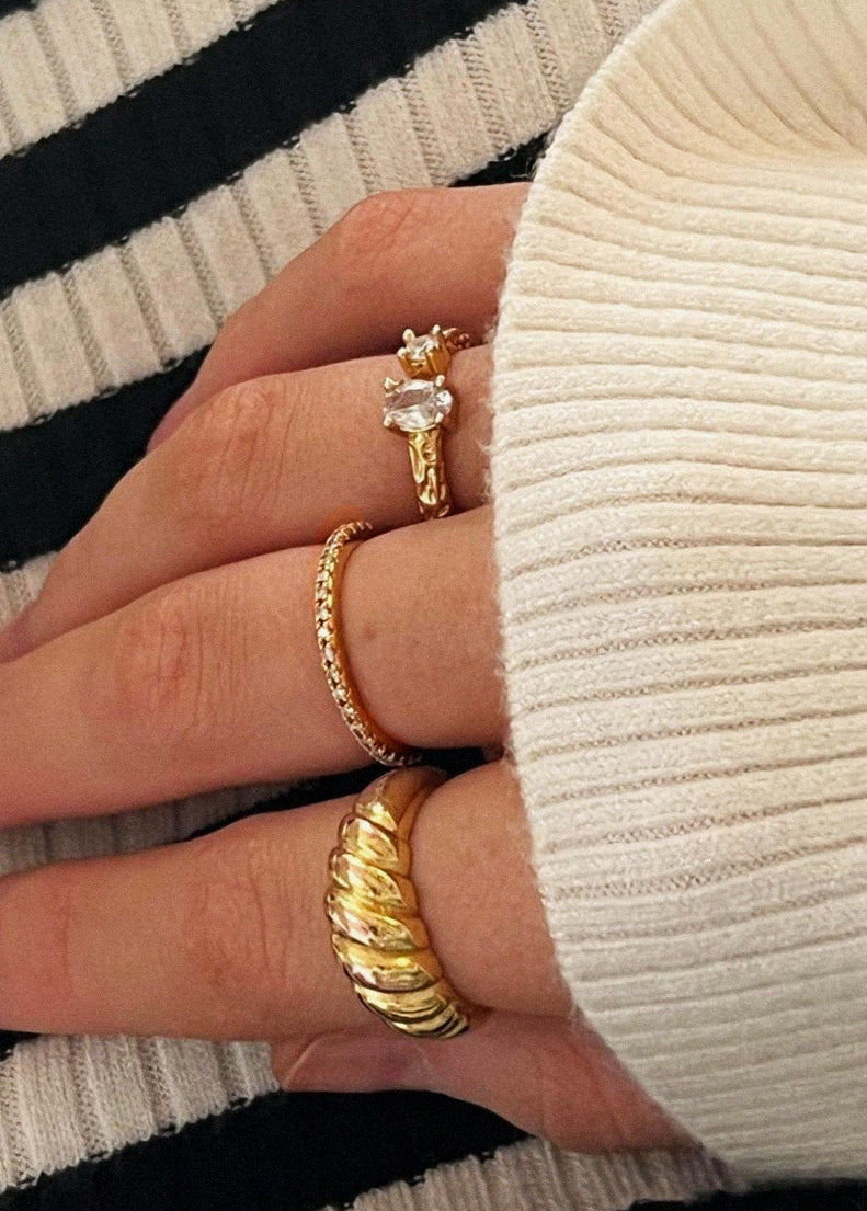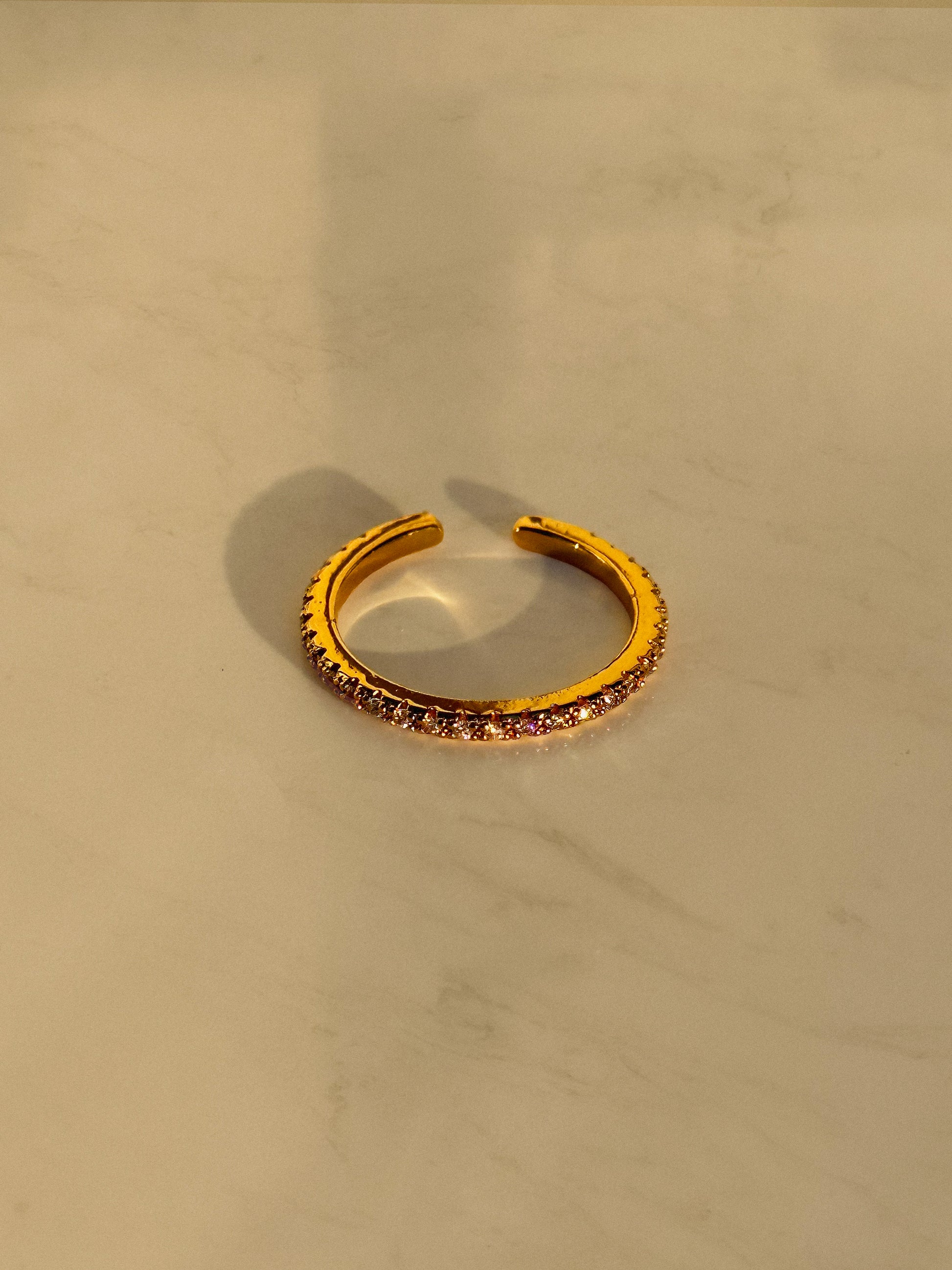 The ring is 18K Gold plated. The brass base has first been beautifully crafted into a marvelous shape that has later been carefully coated in a thick layer of 18K Gold.