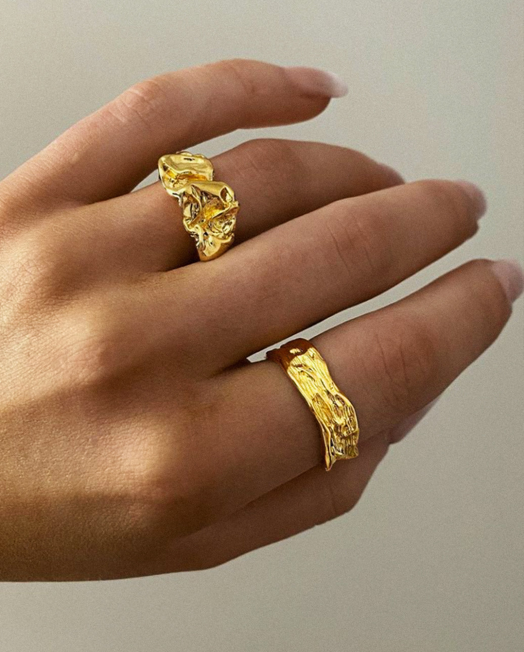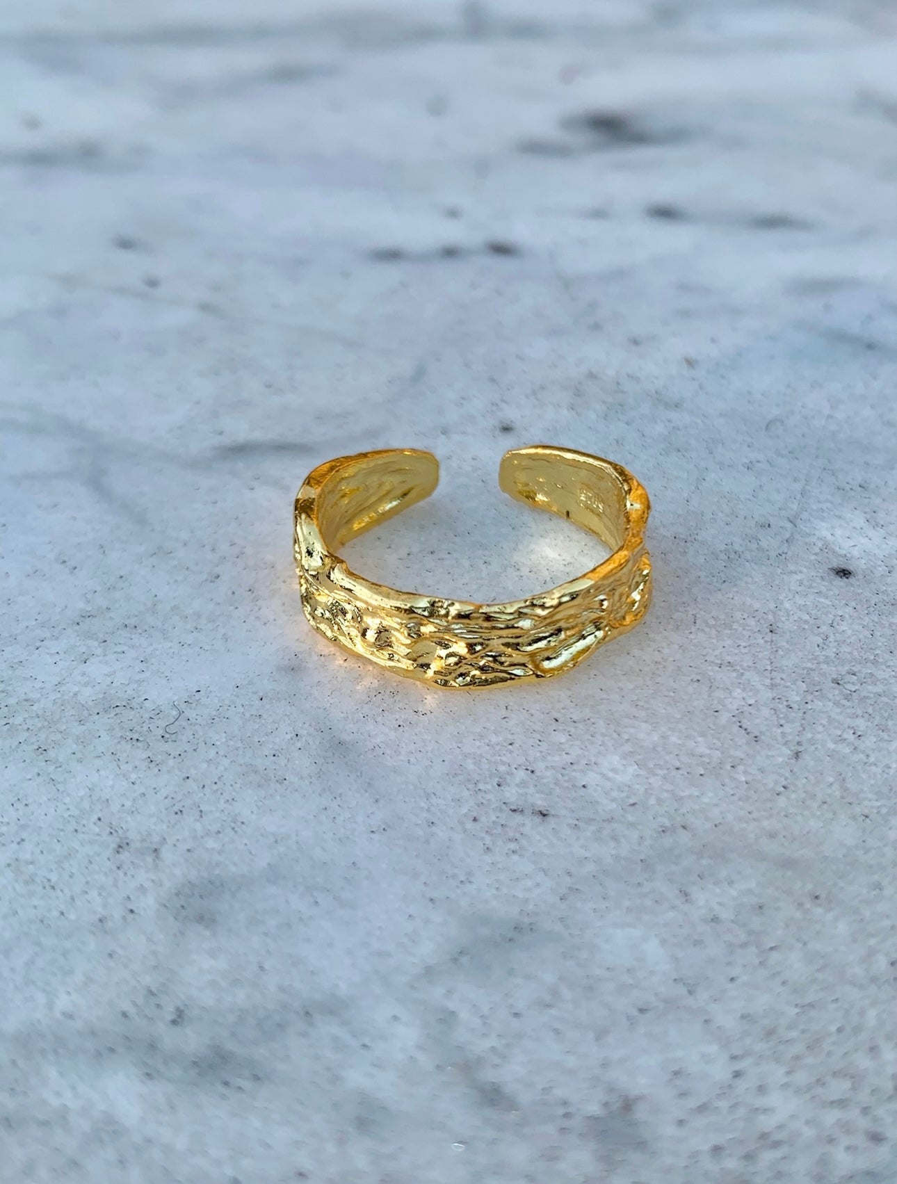 This ring is 18K Gold plated. The brass base has first been beautifully crafted into a marvelous shape that has later been carefully coated in a thick layer of 18K Gold.