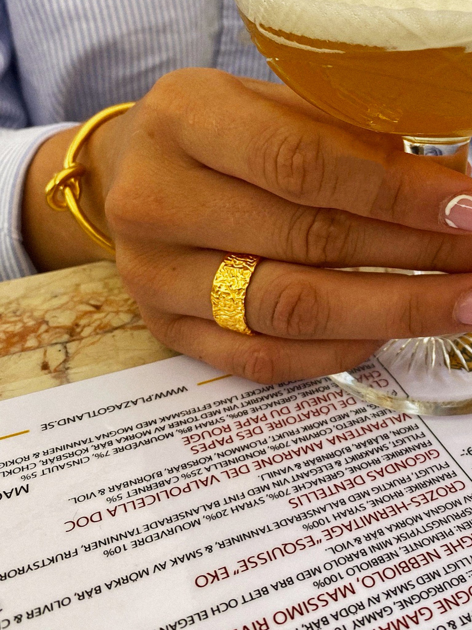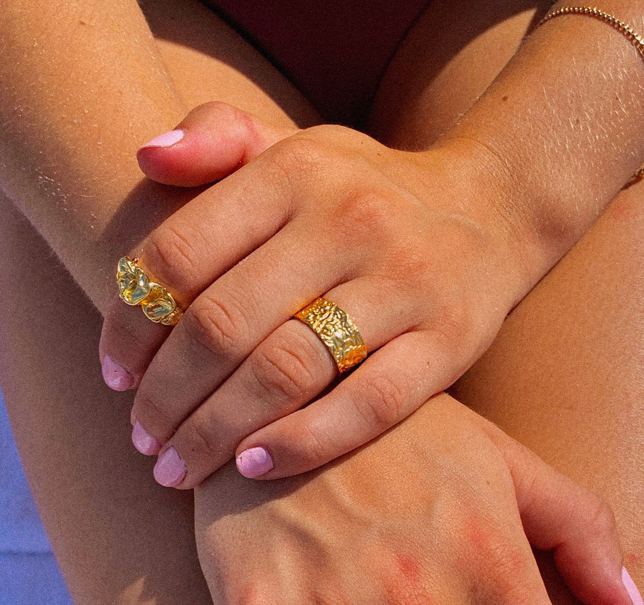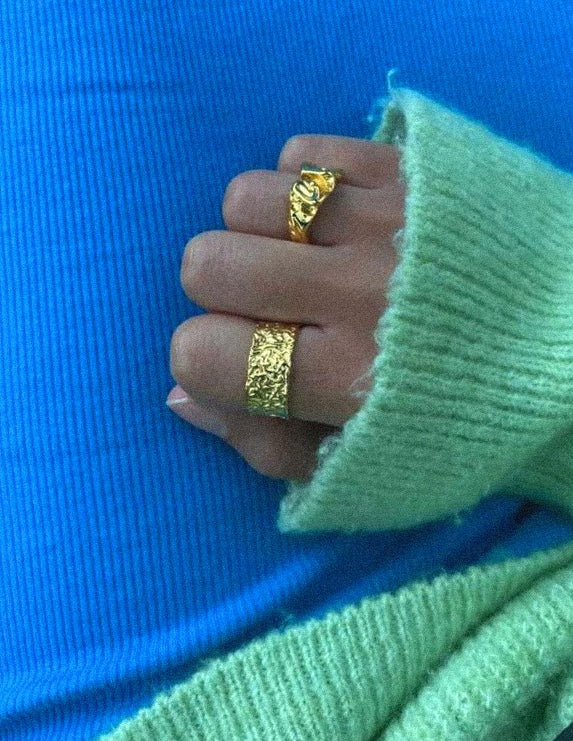 This ring is 18K Gold plated. The brass base has first been beautifully crafted into a marvelous shape that has later been carefully coated in a thick layer of 18K Gold.